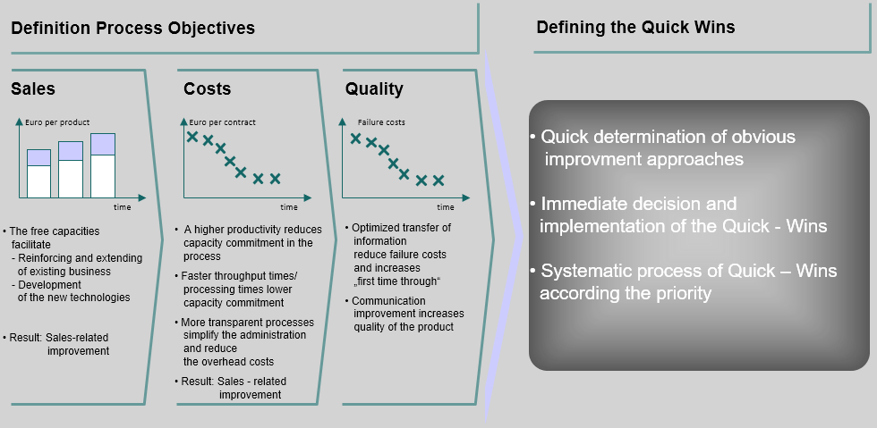 Levers of sales, costs and quality. We examine and prioritize the sub-processes for results that can be achieved quickly.