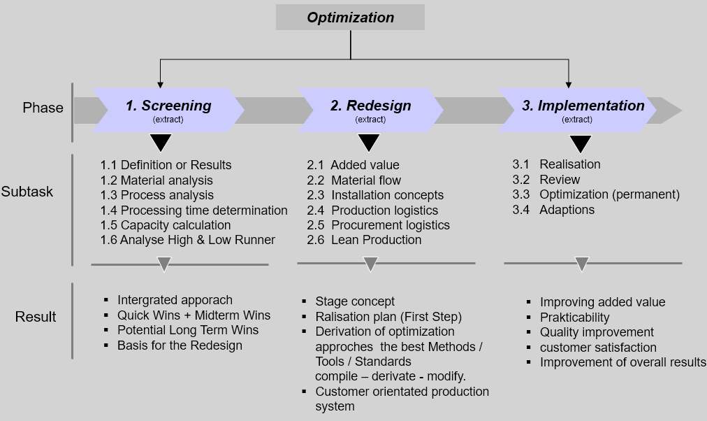 After the quick wins have been defined, the individual building blocks are processed in a three-stage project structure plan according to customer needs (if necessary, even extracts) and a redesign and implementation concept tailored to the customer is created.